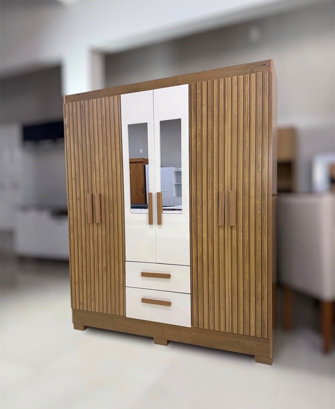 6P2G, Côr Nogueira Madeira/3D Nogueira + Natura/Off White, da Atualle Móveis, Medidas: Alt 1,80m Larg 1,48m Prof 0,40m – 2 Volumes – Estrutura 100% MDP 12mm e 15mm, 6 Portas de Bater com Dobradicas Metálicas, sendo as 4 Laterais em Pintura Ripado 3D, 2 Gavetas Externas com Corrediças Metálicas, Puxadores de Perfil em MDF, 5 Nichos Internos Divididos por 4 Prateleiras, para Roupas, Sapatos, Malas, Bolsas e Demais Itens Pessais, 1 Nicho com Cabideiro de Madeiras para Roupas Longas, Kit Pés em U de PVC, 2 Espelhos e Acabamento em Pintura UV Brilho. (OBS.: DIFERENTEMENTE DA FOTO, OS PUXADORES SÃO DE PERFIL EM MDF)